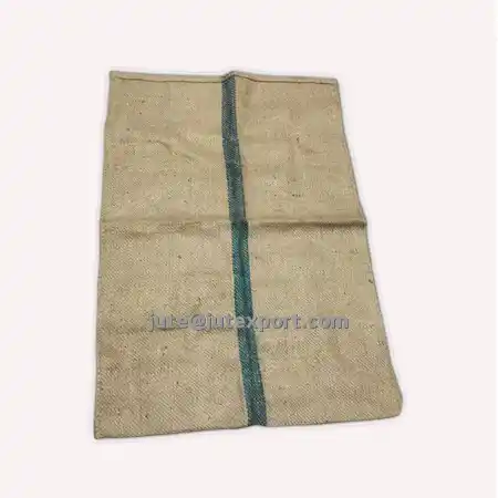 New Heavycces Jute Bags, Size : 43" x 29" (109cm x 74cm), Weight : 2.50 Lbs (1134gr), Porter & Shots : 8 x 9, Hemmed at mouth, Overhead Dry Sewn, 2" Green Stripe, Packed : 400 Pcs per Iron Bound Bale.