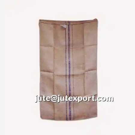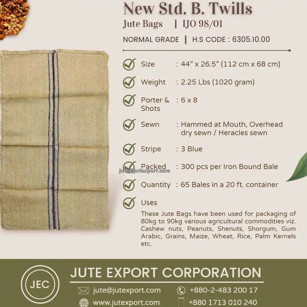 New Standard B. Twills Jute Bags, Size : 44" x 26.5" (112cm x 68cm), Weight : 2.25Lbs (1020gr), Porter & Shots : 6 x 8, Hemmed at mouth, Overhead Dry Sewn or Herackle Sewn, 3 Blue Stripes, Packed : 300 Pcs per Iron Bound Bale.