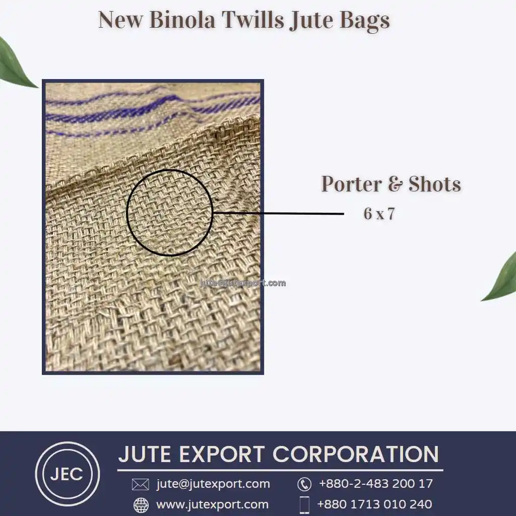 Vegetable Oil Treated - VOT (food grade) New Binola Twills Jute Bags, Size : 44" x 26. 5" (112cm x 68cm), Weight : 2. 00Lbs (907gr), Porter & Shots : 6 x 7, Hemmed at mouth, Overhead Dry Sewn or Herackle Sewn, 3 Blue Stripes, Packed : 300 pcs per Iron Bound Bale.